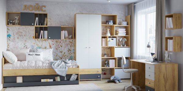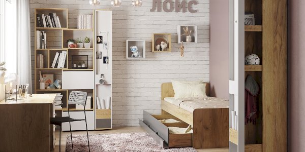 Стеллаж-трансформер - очень "гибкий" по ширине модуль. Его можно раздвинуть на необходимую ширину в пределах от 560 мм до 989 мм, таким образом занимая отведенное для него место в детской с точностью до миллиметра. Установите его как самостоятельный модуль или между шкафами, регулируя общую ширину шкафной группы. Также такой стеллаж отлично подойдет и для размещения в нише. С его помощью делать перестановку в комнате легко и просто! Дополнительно секции фиксируются между собой на межсекционные стяжки. Шкаф крепите к стене на подвесы! Ящики на шариковых направляющих полного выдвижения без лишней фурнитуры и удобно открываются за фасад.