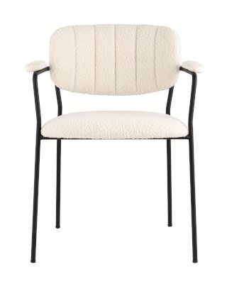 Современный обеденный стул с подлокотниками и металлическими ножками. Обивка выполнена из мягкой и легкой ткани букле. Красивый и очень мягкий материал, который оставляет ощущение теплоты и уюта. Металлический каркас черного цвета огибает спинку и плавно переходит из подлокотников в ножки. Широкое сиденье обеспечивает удобную посадку и уют. На подлокотниках для дополнительного комфорта предусмотрены мягкие накладки.