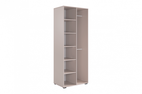 Шкаф оснащён длинными пластиковыми ручками и имеет удобное внутреннее наполнение: слева расположены полки, а справа — две штанги для вешалок. Это позволяет рационально использовать пространство и разместить различные типы одежды.