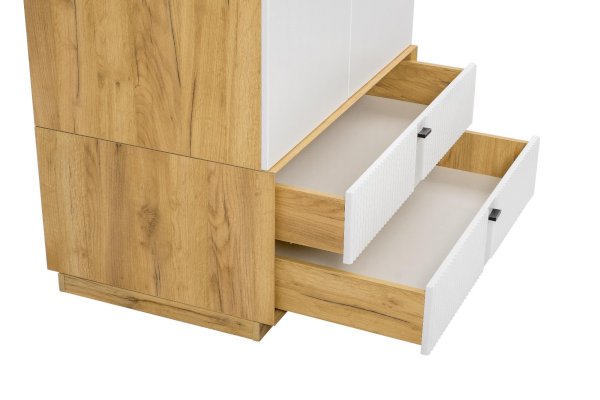 • Шкаф разделен на 2 отделения: нижнее с двумя ящиками друг под другом на направляющих нижнего крепления не полного выдвижения с доводчиком