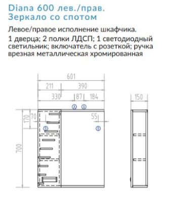Зеркало Diana 600 со спотом (Виго) - за 8 588 руб. в Челябинске. Купите на сайте mebelmarket-chelyabinsk.ru или по телефону 8(800)505-30-63 уже сегодня! Уточнить наличие, комплектацию, актуальную цену можно бесплатно у менеджера ежедневно. Закажите Зеркало Diana 600 со спотом (Виго) до конца акции! Доступна покупка в кредит, рассрочку. Доставим со склада или на заказ.