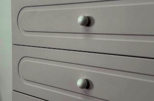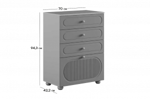 Корпус комода выполнен из ЛДСП толщиной 16 мм, фасады изготовлены из МДФ в плёнке ПВХ. Фасады с фрезеровкой подчёркивают аккуратный внешний вид изделия. Оригинальные круглые ручки и опоры придают комоду современный и лёгкий характер, делая его гармоничной частью детского интерьера.