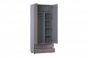 Слева внутри шкафа расположена штанга для плечиков, предназначенная для хранения одежды на вешалках. Правая часть оборудована полками, которые подойдут для аккуратного размещения сложенной одежды, коробок или аксессуаров. В нижней части предусмотрены два вместительных выкатных ящика для хранения, обеспечивающих дополнительное место для вещей повседневного использования.