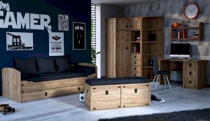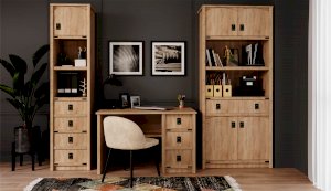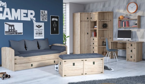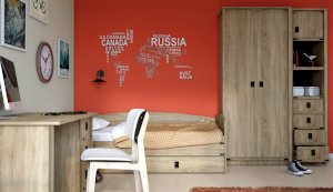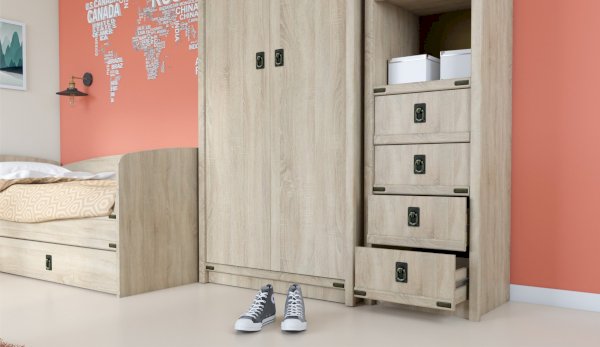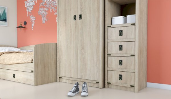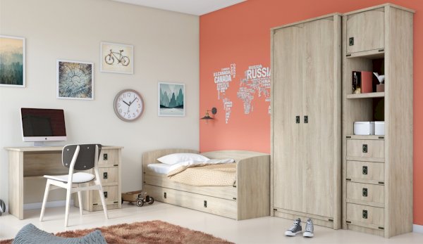 Пенал с открытыми и закрытыми полками служит для хранения учебников, тетрадей и других письменных принадлежностей. Декоративные накладки и профиль из МДФ по вертикальным краям закрывают острые края корпуса и придают шкафу более эффектный и надежной вид. Декоративные элементы на фасаде и металлические ручки MARINE бронзового цвета стилизованы под морскую тематику. Идеально компонуется со всеми модулями системы Валенсия.