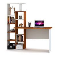 Компьютерный стол, комбинированный с открытой стеллажной системой, позволяет создать удобное и функциональное рабочее место на минимальной площади. На широкой прямой столешнице комфортно помещается ноутбук или планшет; при необходимости за столом можно работать с бумажными документами. Стеллаж заполняется книгами, учебниками, компьютерными принадлежностями, сувенирами. Простые формы оживляются контрастным сочетанием декоров – белый цвет и имитация натурального дерева. Модель предназначена для современных интерьеров.